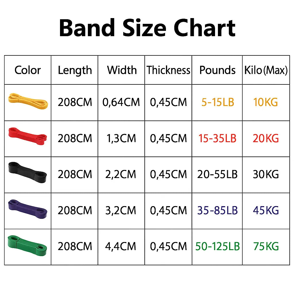 • 5 bandes disponibles : jaune (10kg), rouge (20kg), noir (30kg), violet (45kg), vert (75kg)